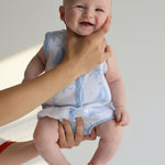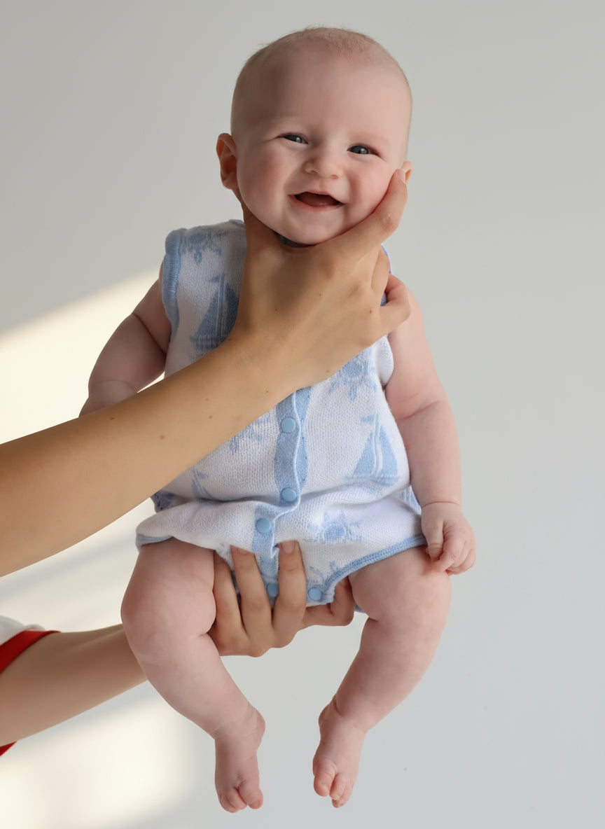 ✨Our Coastal Cotton Knitted Bubble Romper is the perfect lightweight outfit for summer. Designed with soft cotton knit for comfort, it features blue snap buttons down the front and at the crotch for quick and easy nappy changes.