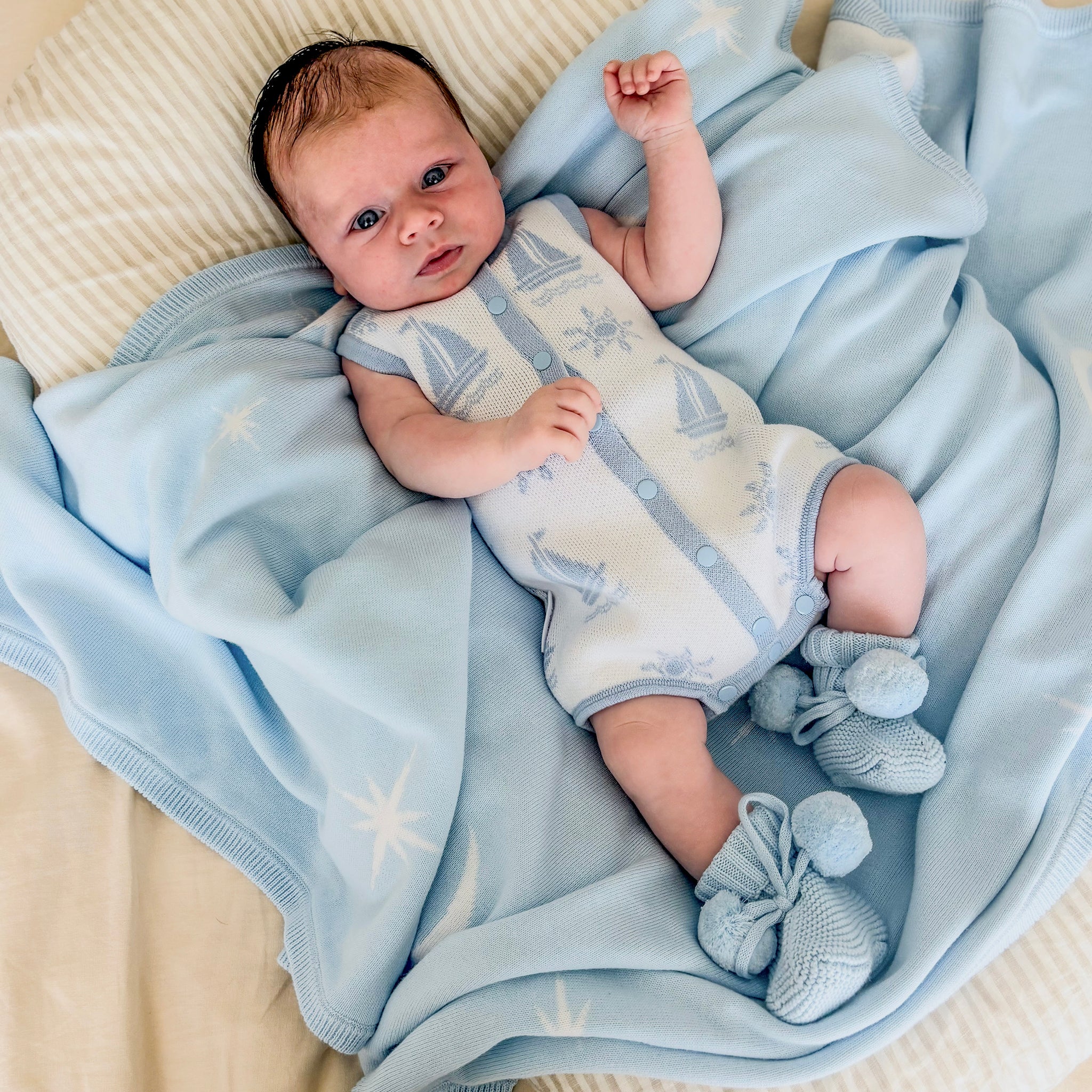 baby wearing coastal bubble romper with baby blue booties with pom poms laying on a baby blue blanket dummy in mouth
