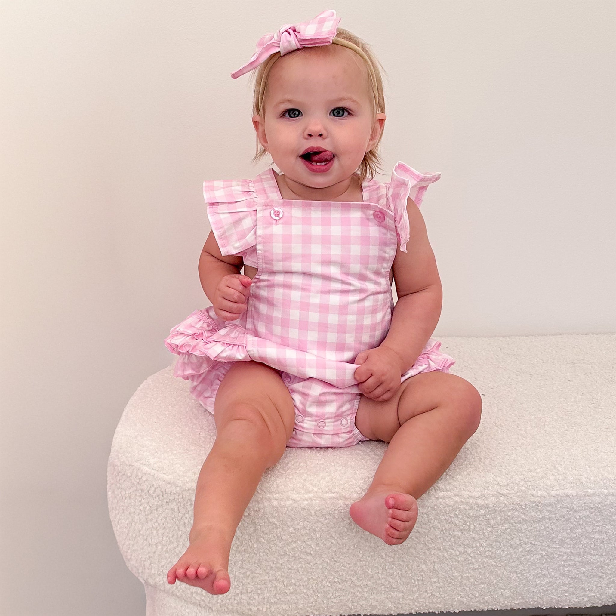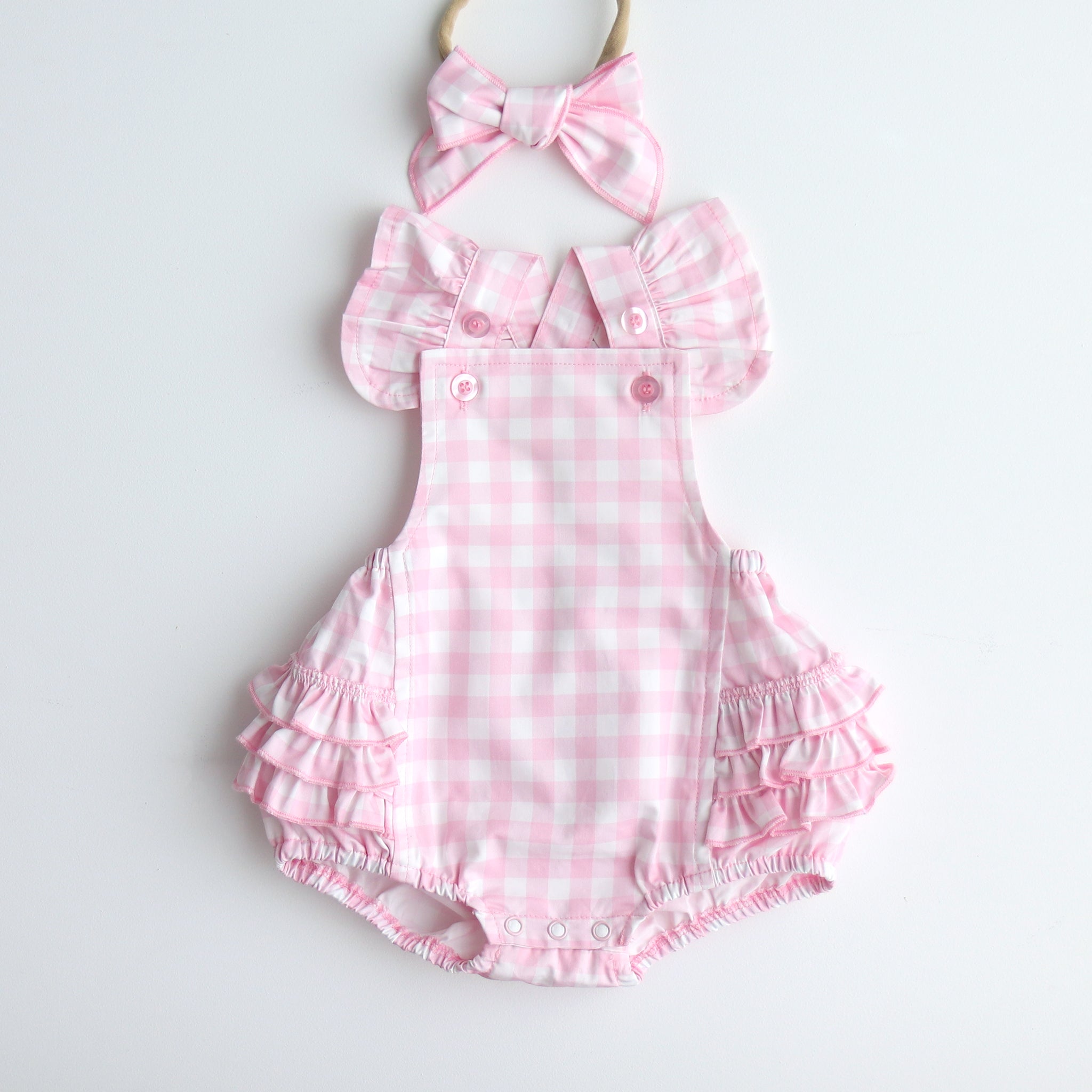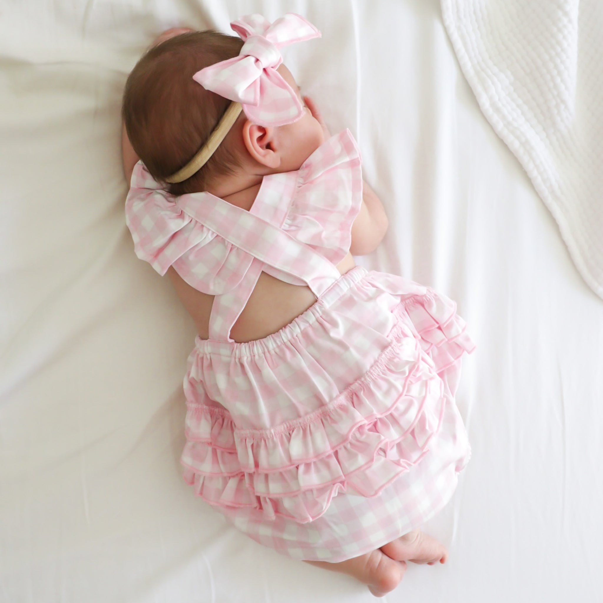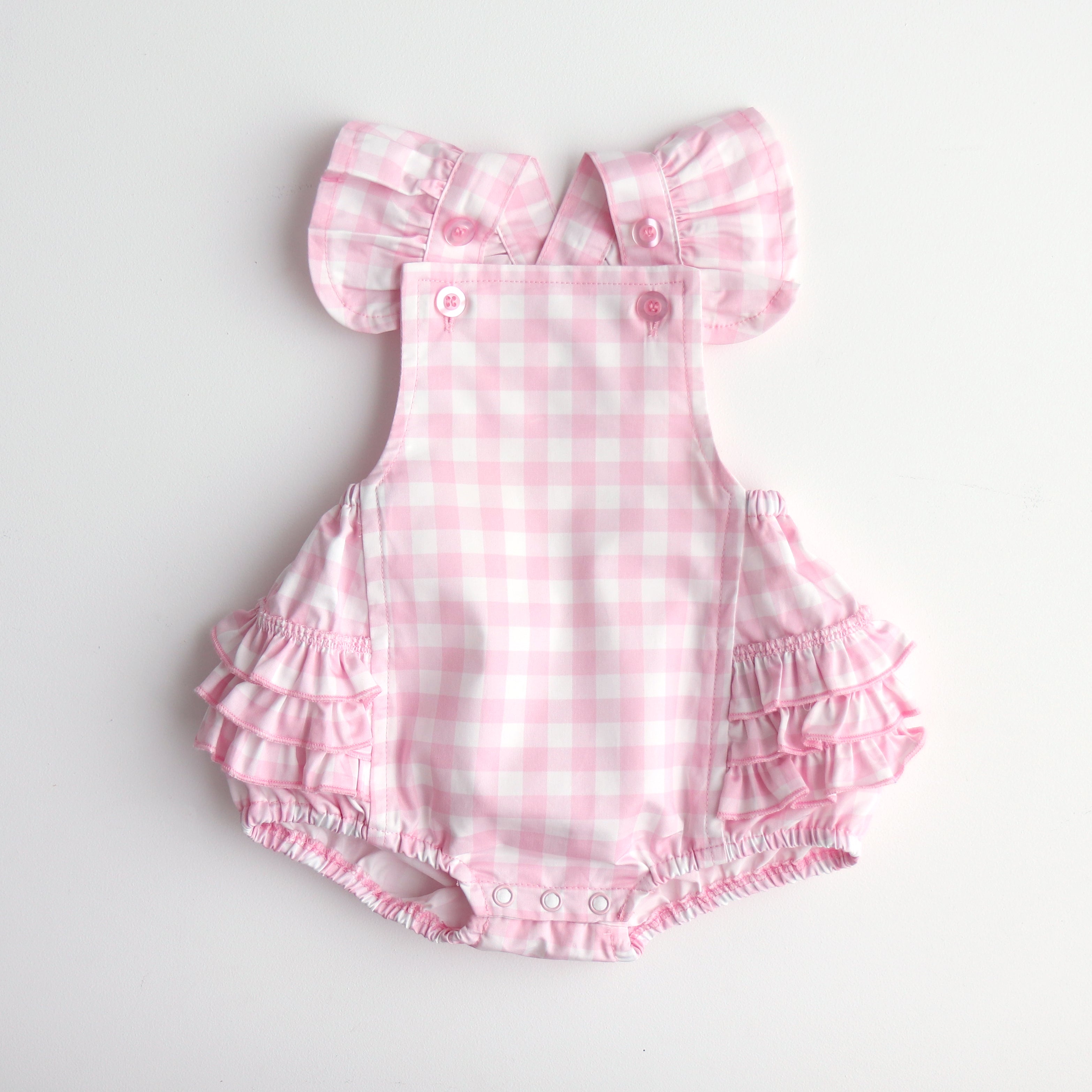 Pink checkered baby romper with ruffles on a white blanket