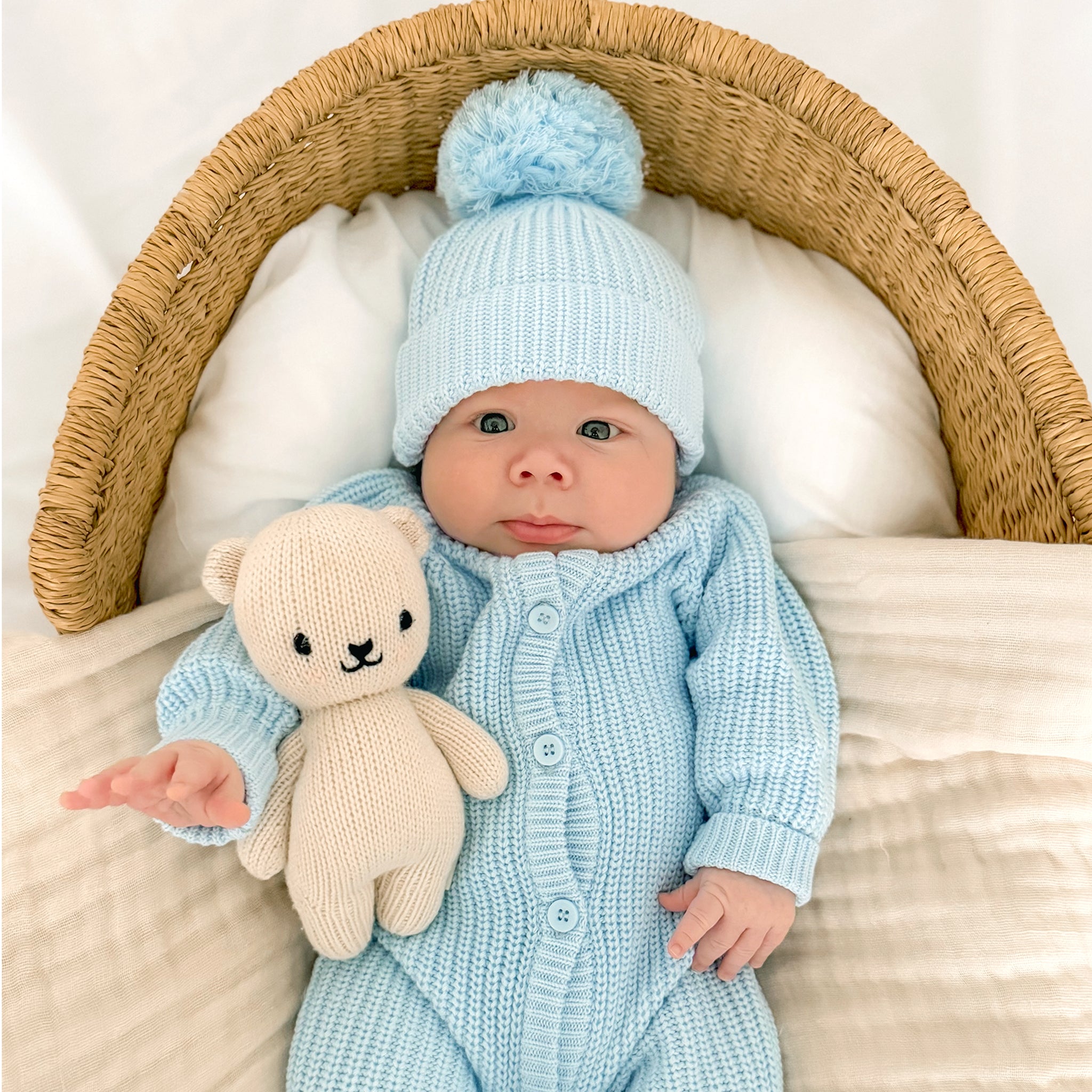 Our beautiful Cotton Knitted Baby Blue Beanie with pom poms is designed to keep your newborn boy or girl snug & looking oh so adorable for those announcement & coming home photos. Matching knitted Baby Blue Chunky Knit Romper, Hello World Heirloom Romper & Booties - sold separately. 0 to 3 months & 3 to 12 months