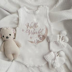 ✨Our beautiful Koala Hello World Flat Knit Romper - Summer is the cutest outfit for the announcement of your baby. This best selling outfit is perfect for a newborn announcement gift & announcement photos.