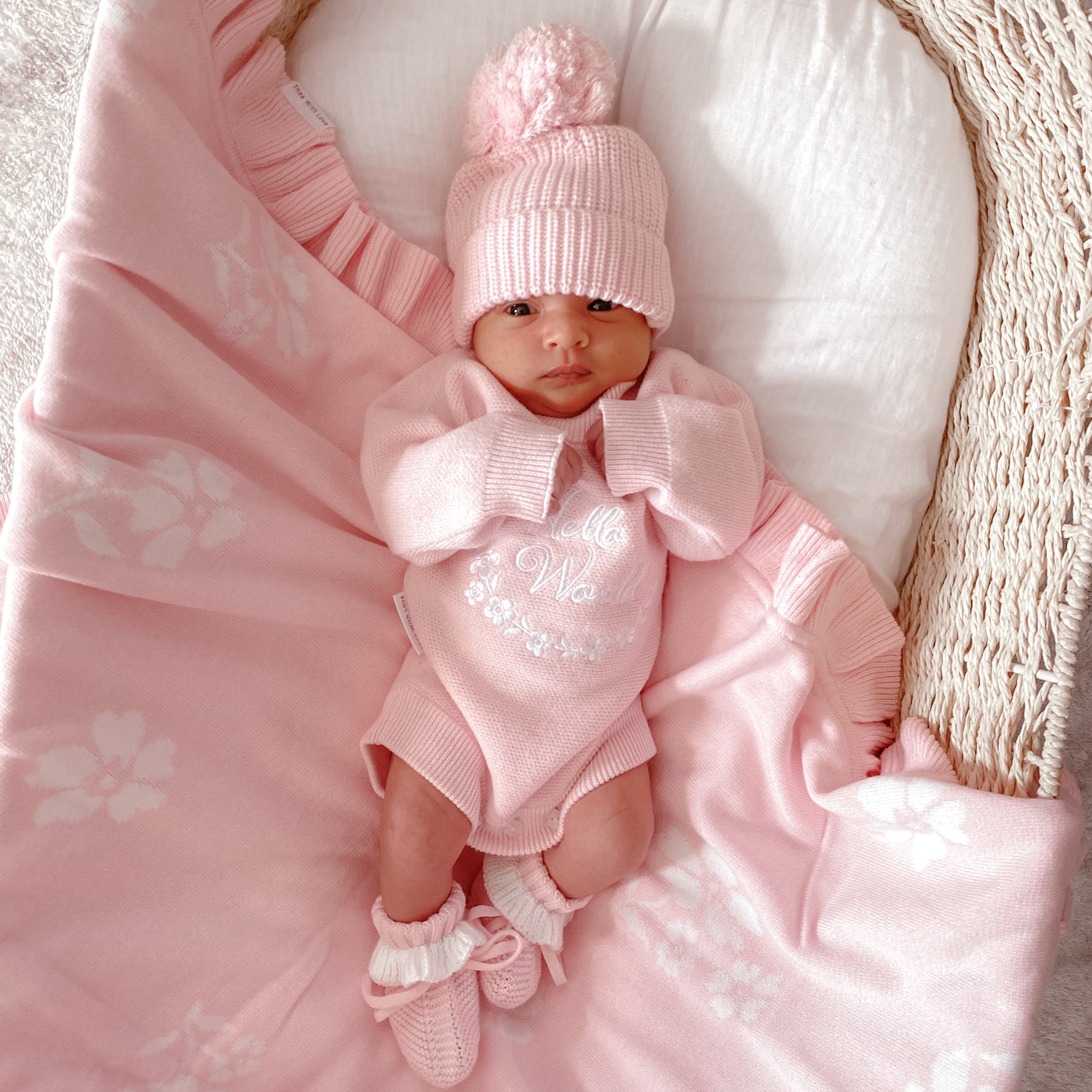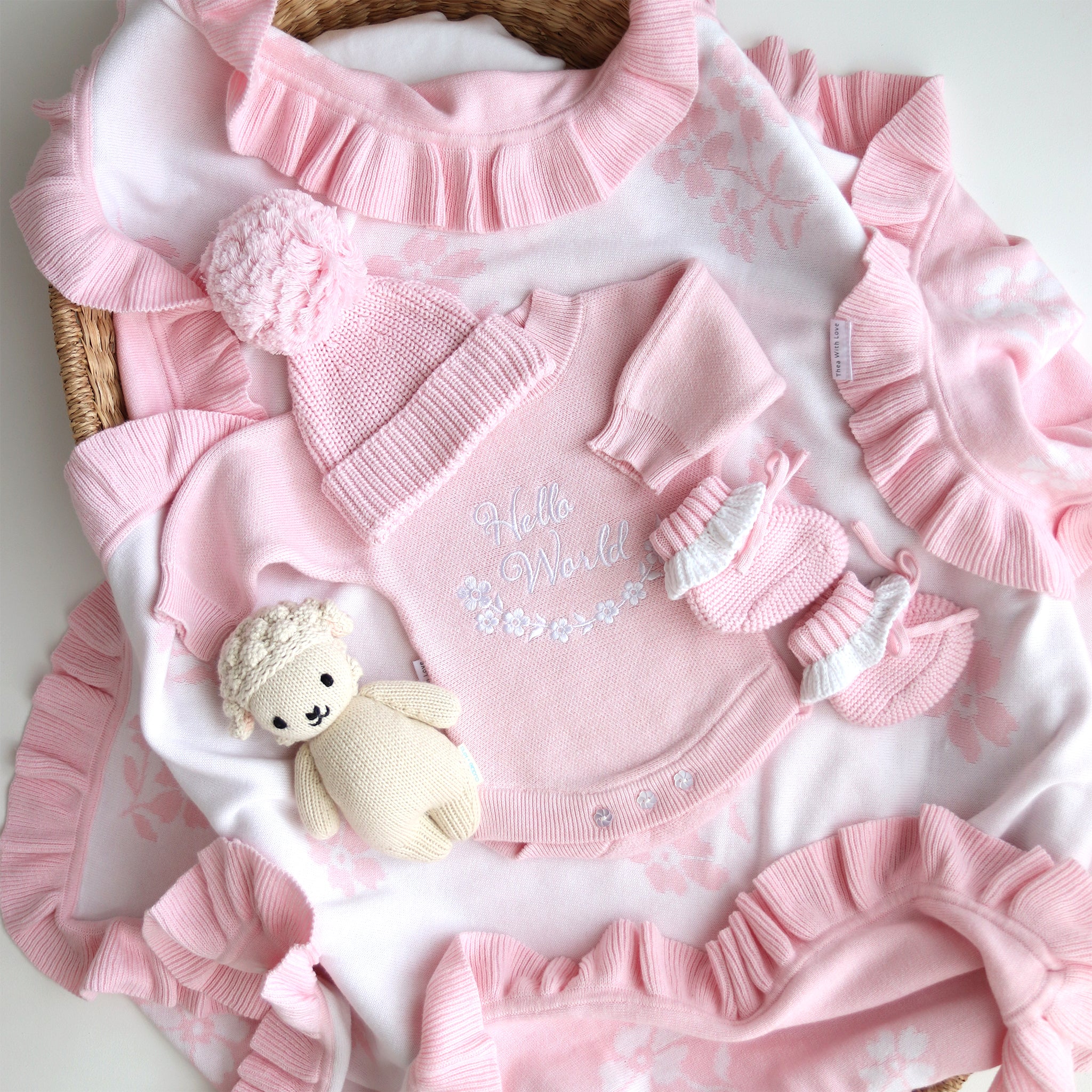 Pretty Pink Hello World Set With Cute Frilly Booties & Beanie