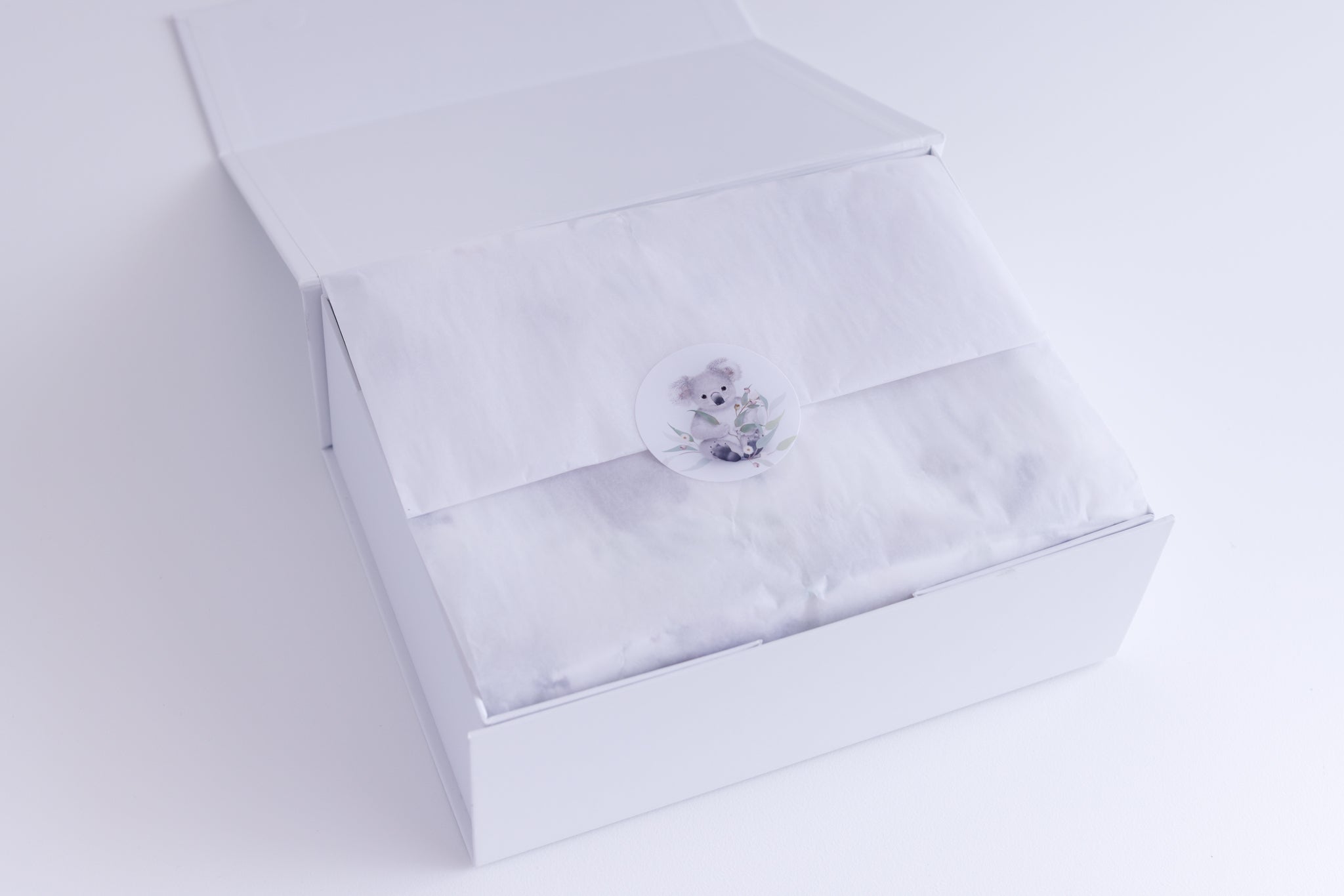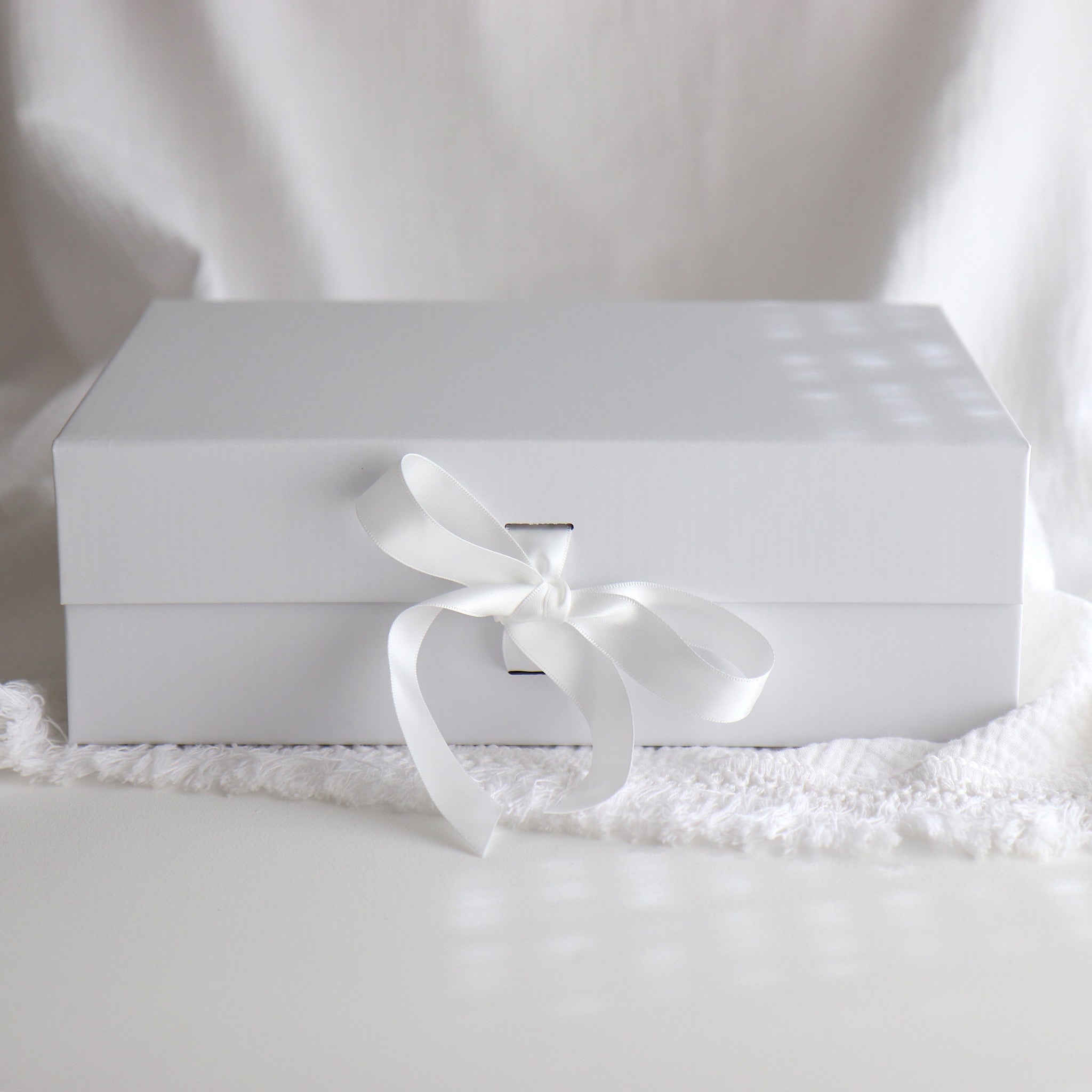 Our Small Keepsake Gift Box is elegant and stylish. With a smooth matte embossed finish inside and out, a secure snap closure and tied with a white bow, our gift box is the perfect choice for you when you want to send Thea With Love gifts to your loved ones. Your loved one can also reuse the box as a keepsake box to store mementos of baby's special times!