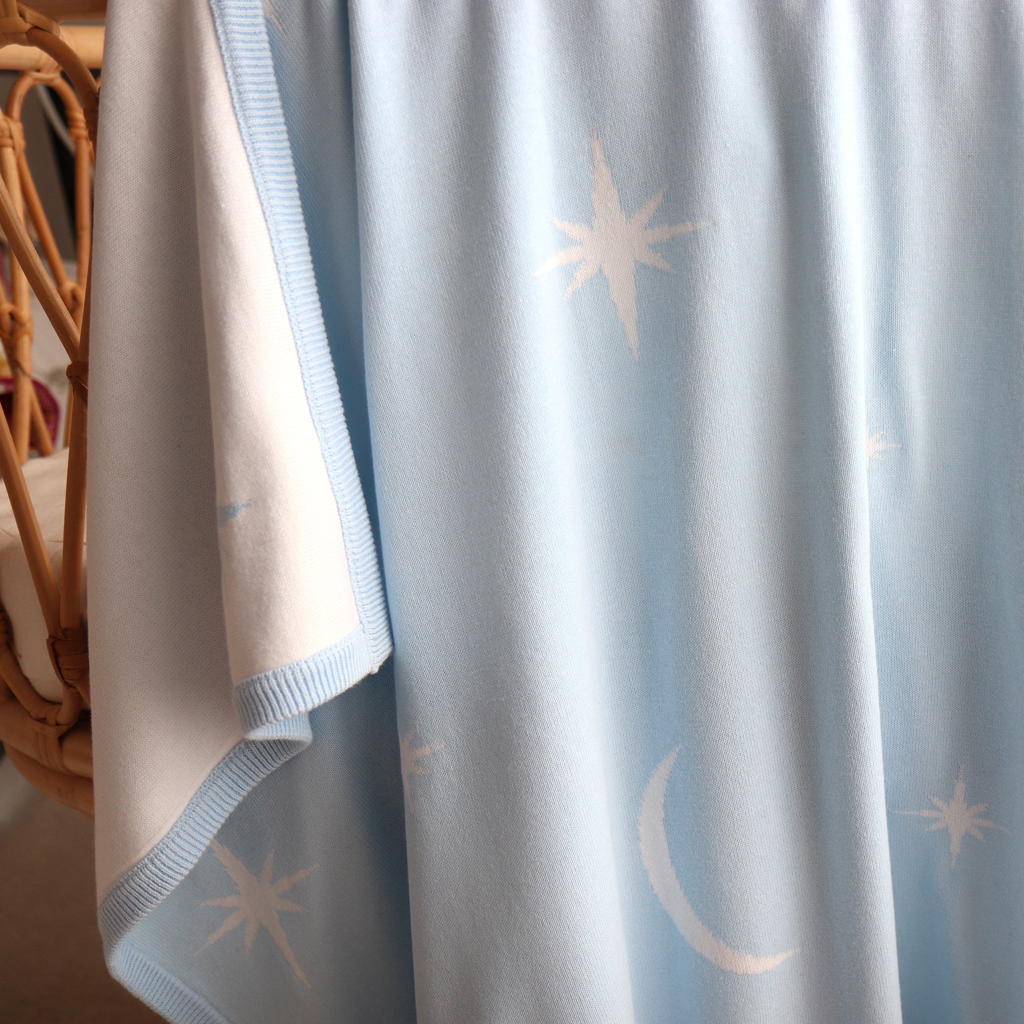 Baby blue blanket with star and moon patterns draped over cane bassinet.