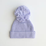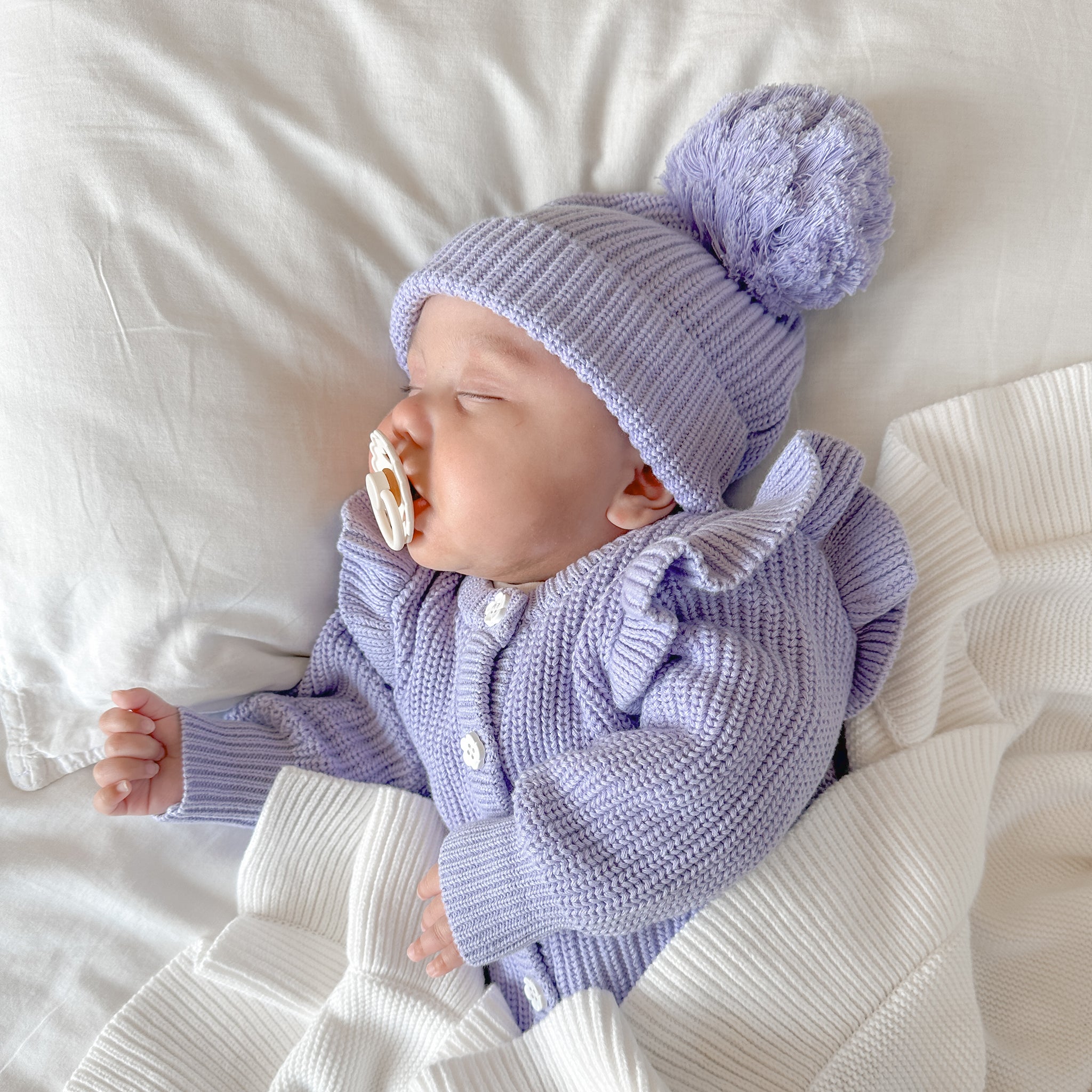 Baby wearing a purple knit outfit with a matching beanie on a white blanket