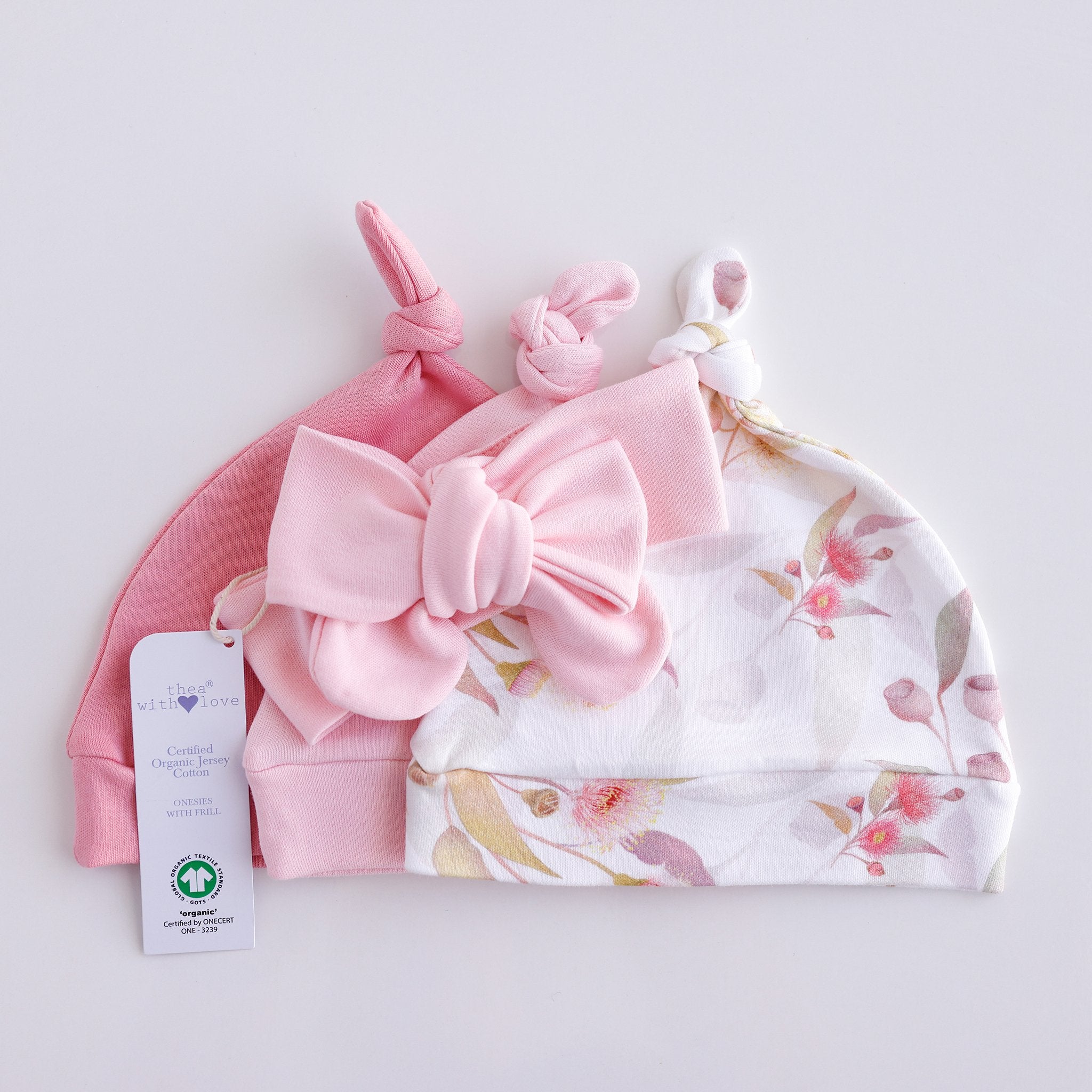Ethically produced from soft organic cotton jersey our Blossom Beanie comes with a knotted top so you can adjust the crown height as your baby girl grows. Perfect for your announcement and coming home photos.