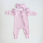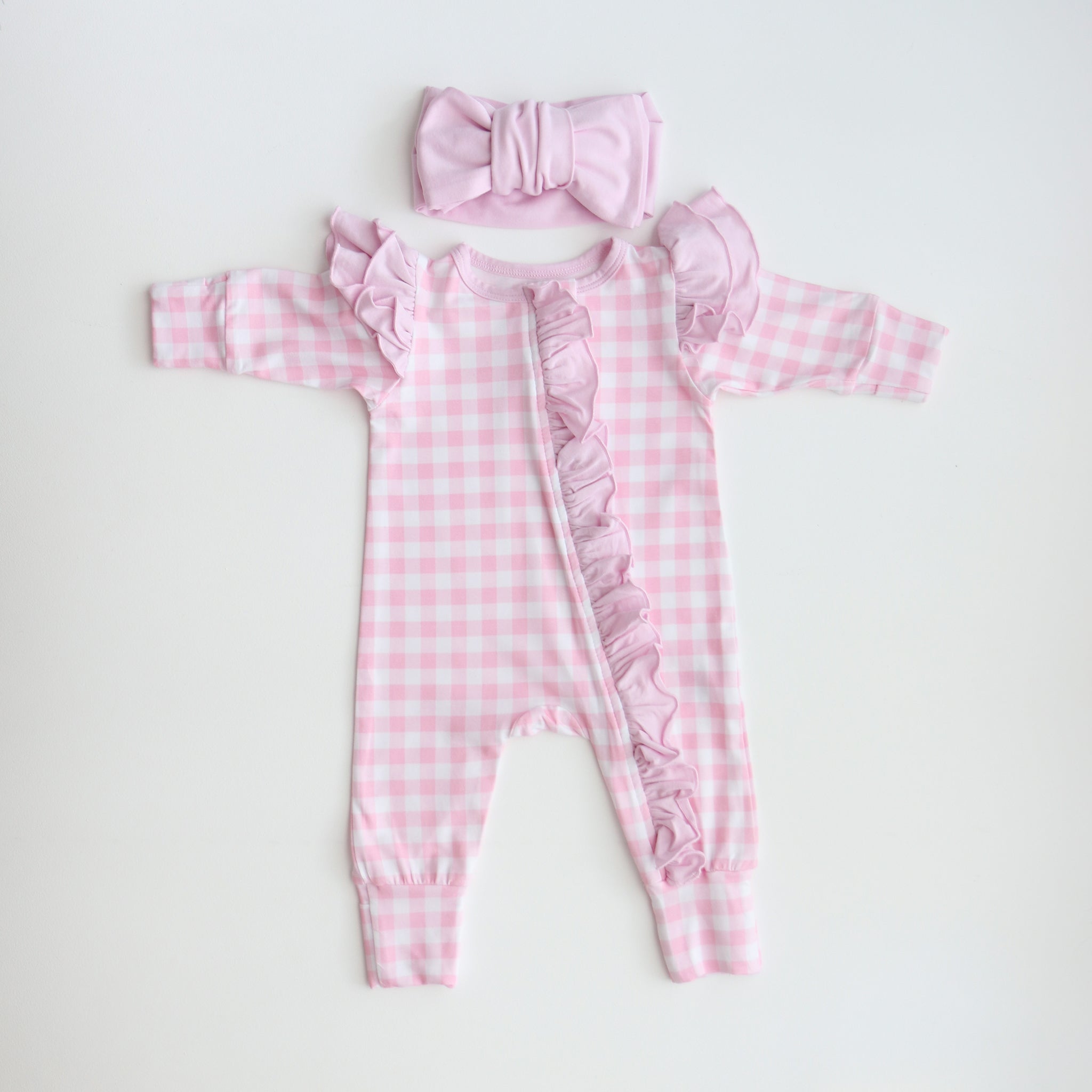 Pink checkered baby romper with ruffles and matching headband on a light gray background