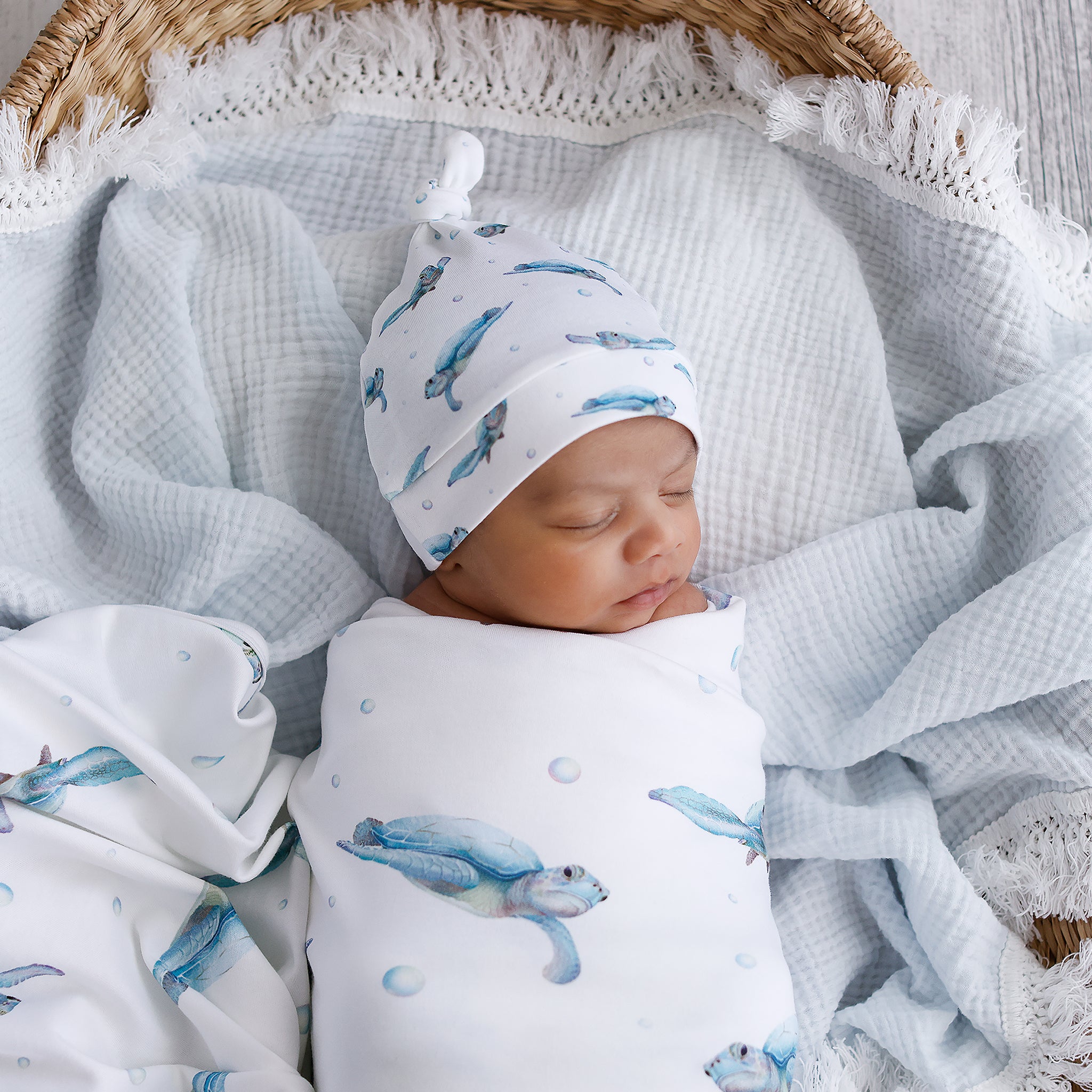 Ethically produced from soft organic cotton jersey our gender neutral Ocean Turtle Beanie comes with a knotted top for extra cuteness!