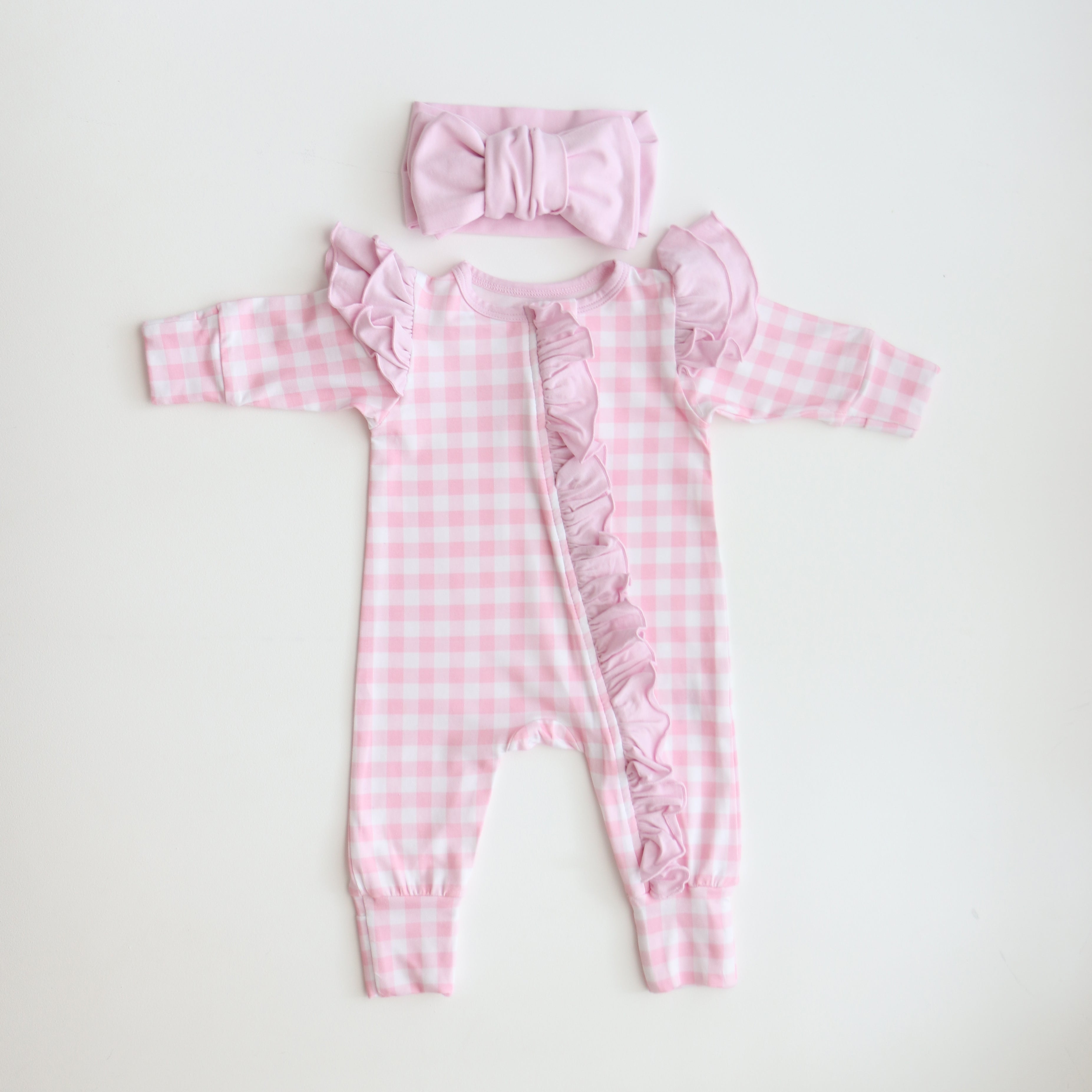 Pink Gingham Frilly Onesie & Gingham Bow Set
