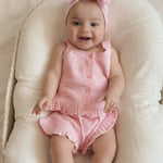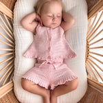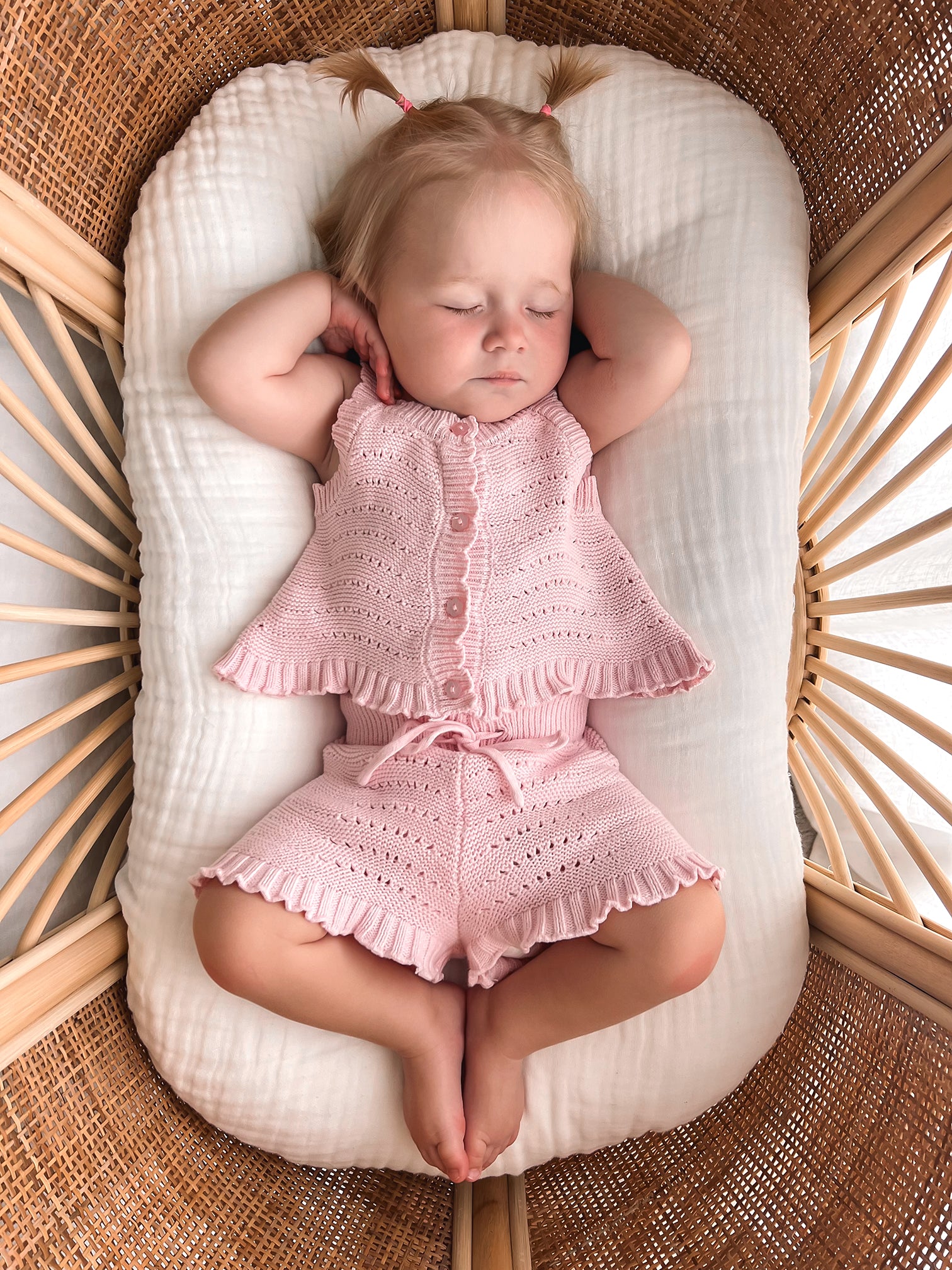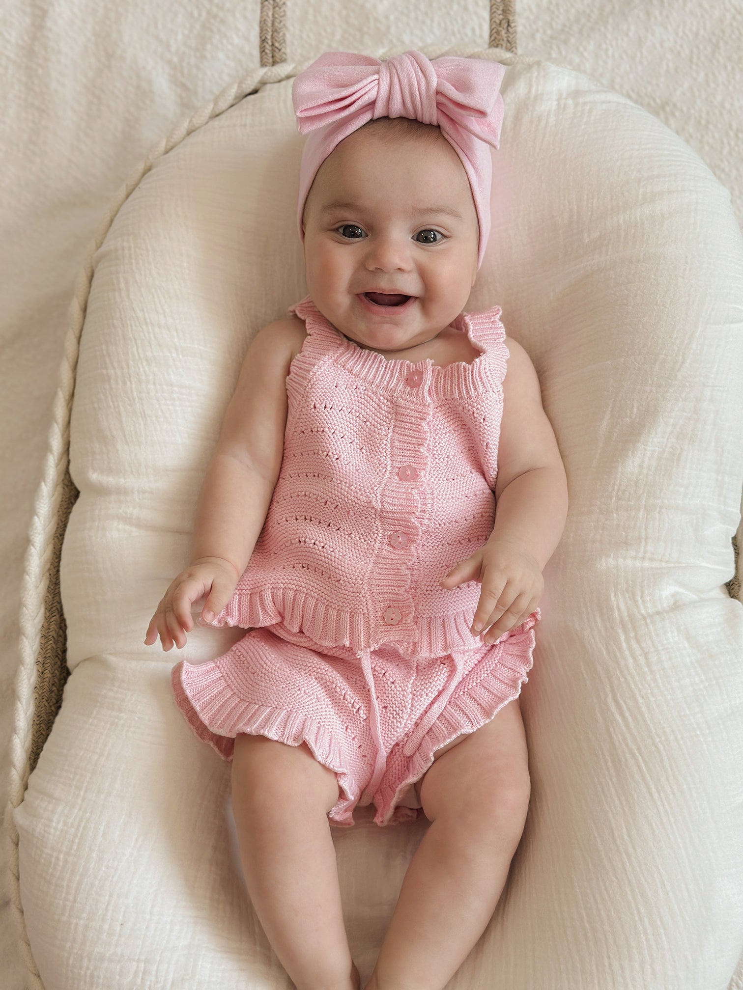 Baby in pink florence lace top and shorts with a matching bow headband lying in bassinet