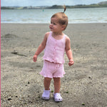 pink knitted short sleeve singlet top. eyelet wave pattern light weight frill on hem, Young girl 3 years old wearing top & shorts