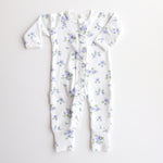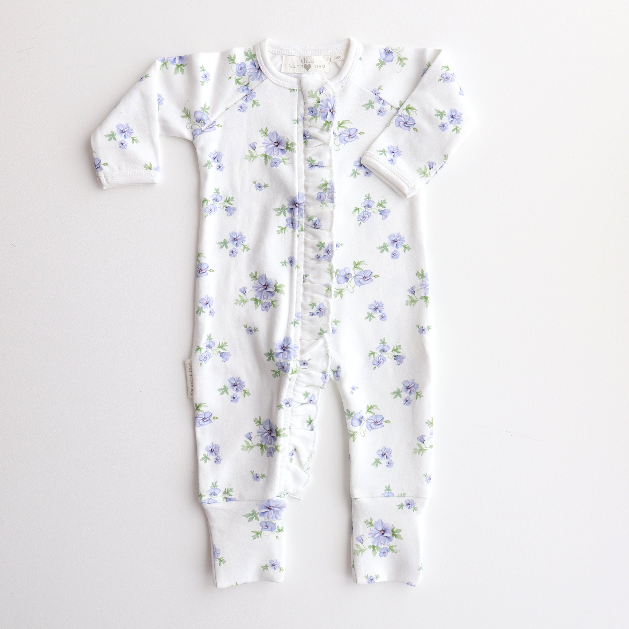 ✨ The perfect baby shower gift or coming-home outfit. Featuring a two-way zip with protector, fold-over feet, and a sweet ruffle frill for extra charm. Made from GOTS Certified Organic Cotton in our exclusive Hibiscus Posy print by Jan Brown.