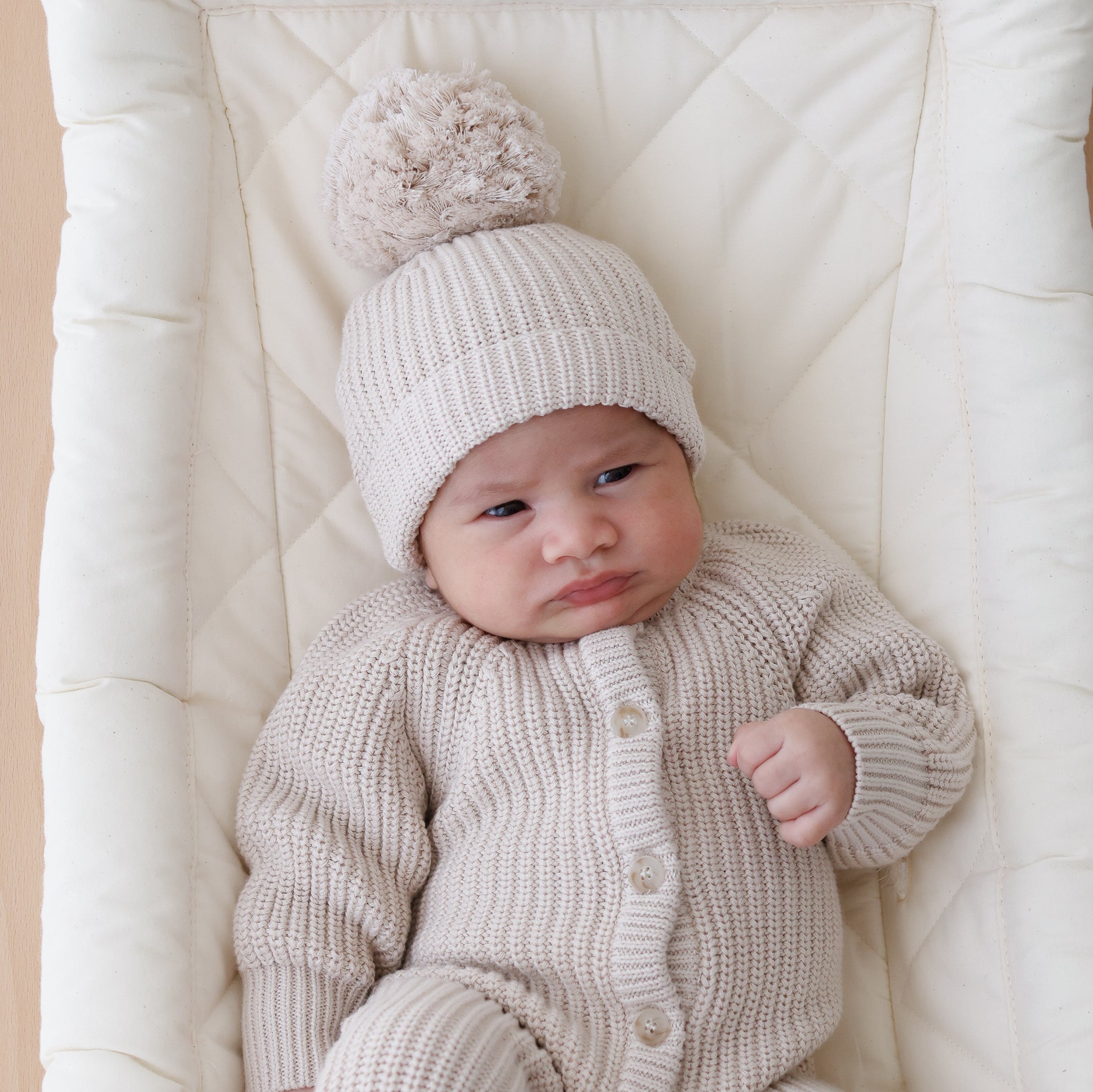 Our beautiful Cotton Knitted Baby Beanie Milky Coffee with pompom is designed to keep your newborn boy or girl snug & looking oh so adorable for those announcement & coming home photos. Matching knitted Milky Coffee Chunky Knit Romper, Heirloom Romper & Booties - sold separately. 0 to 3 months & 3 to 12 months