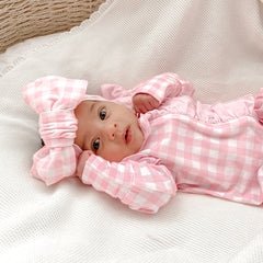baby dressed in pink gingham frilly onesie with matching one size bow sitting on white blanket